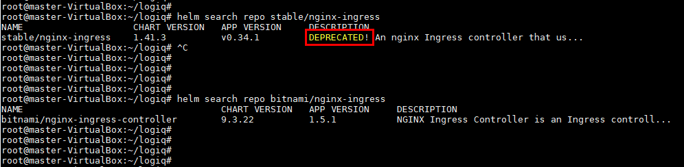 원래는 stable repository에 있는 nginx-ingress를 설치하려고 하였으나.. 차트 설명이 DEPRECATED로 되어있기 때문에 bitnami repository를 이용하도록 한다.