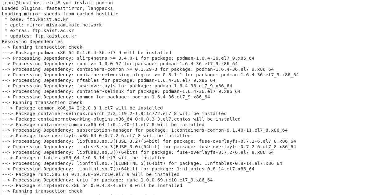 - RHEL / CentOS 7의 경우 기본 Extras repo에서 podman을 사용할 수 있으므로 yum install podman 명령을 사용하여 설치가 가능