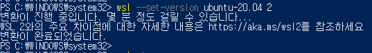 - WSL 버전이 1에서 2로 업데이트 된 것을 확인할 수 있음