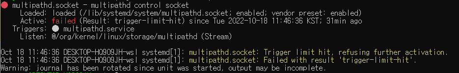 Oct 18 11:46:36 DESKTOP-HQ9O9JH-wsl systemd[1]: multipathd.socket: Failed with result 'trigger-limit-hit'.