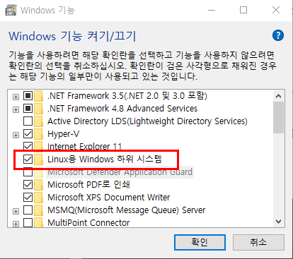 - WSL은 윈도우에 추가기능으로 등록되어 있어 해당 기능을 수동으로 켜주어야함