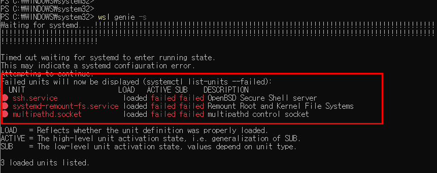 * systemd-remount-fs.service / multipathd.socket 에러만 처리하고 다시 wsl genie -s 명령어를 하면 에러없이 시작이됨!