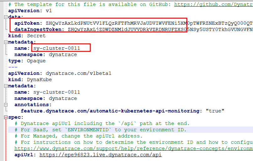 dynakube.yaml 파일에는 UI에서 설정한 항목들과 apiToken, dataIngestToken이 발급되어 있고,